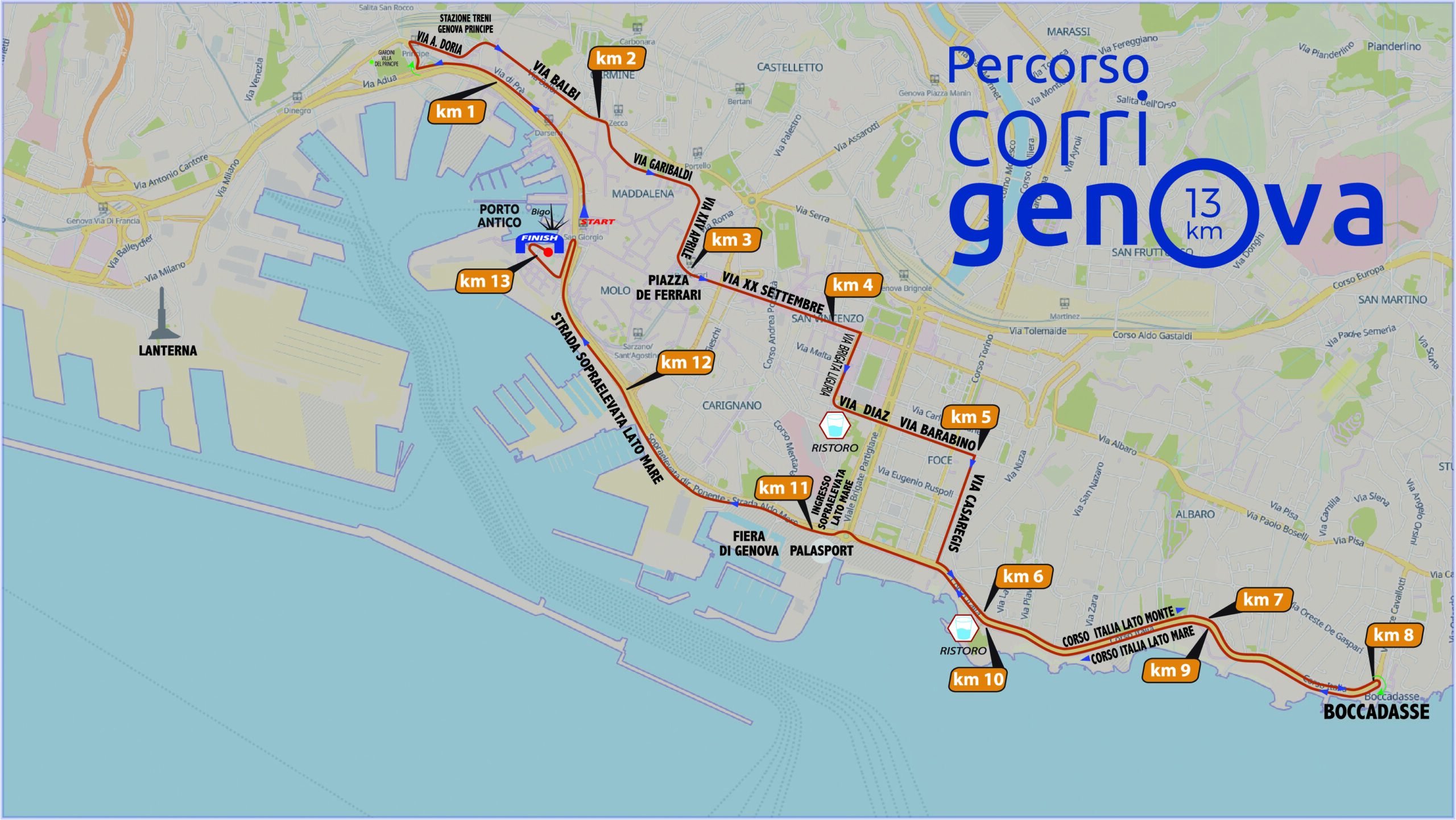 La Corri Genova è una corsa non competitiva di circa 13 km con partenza e arrivo al Porto Antico di Genova.